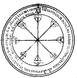 Ce Pentacule se fait pour se rendre les Esprits de Jupiter favorables il se doit faire sur de l'Etain au mois de 9bra ou de fevrier au jour et heure de Jupiter, si lon le fait sur du parchemin de cerf qui aura été tue dans l'un de ces meis, ecrit avec les couleurs convenable avec une plume d'Aigle. |