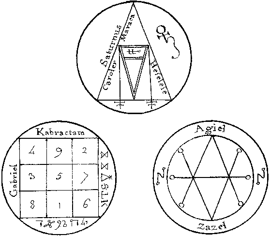 [3 pentacles from Magical Calendar, Venus] La figure de Venus est carrée, sont sept multipliés par sept et en chacun font cent soixante quinze, elle vaut pour l'amour des femmes. |